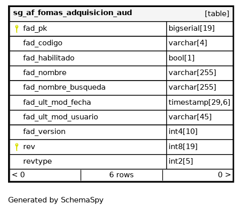 | sg_fomas_adquisicion_aud_pkey | Primary key | Asc/Asc | fad_pk + rev |