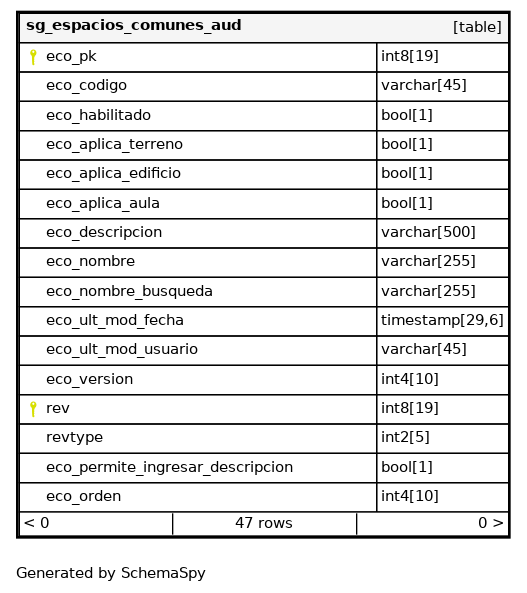 | sg_espacios_comunes_aud_pkey | Primary key | Asc/Asc | eco_pk + rev |