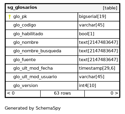 | sg_glosarios_pkey | Primary key | Asc | glo_pk |