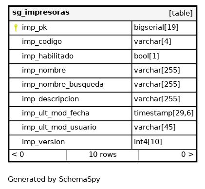 | imp_pk | bigserial | 19 | √ | nextval('catalogo.sg_impresoras_pk_seq'::regclass) |