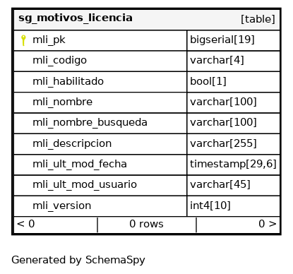 | sg_motivos_licencia_pkey | Primary key | Asc | mli_pk |