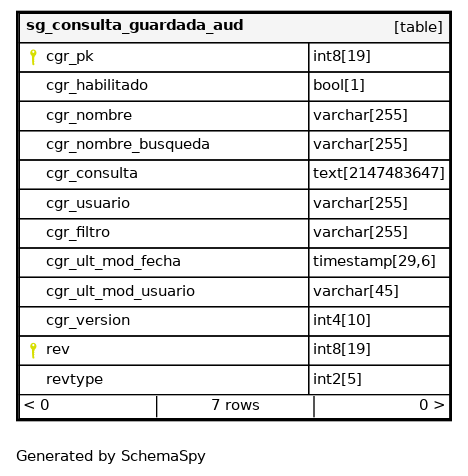 | sg_consulta_guardada_aud_pkey | Primary key | Asc/Asc | cgr_pk + rev |