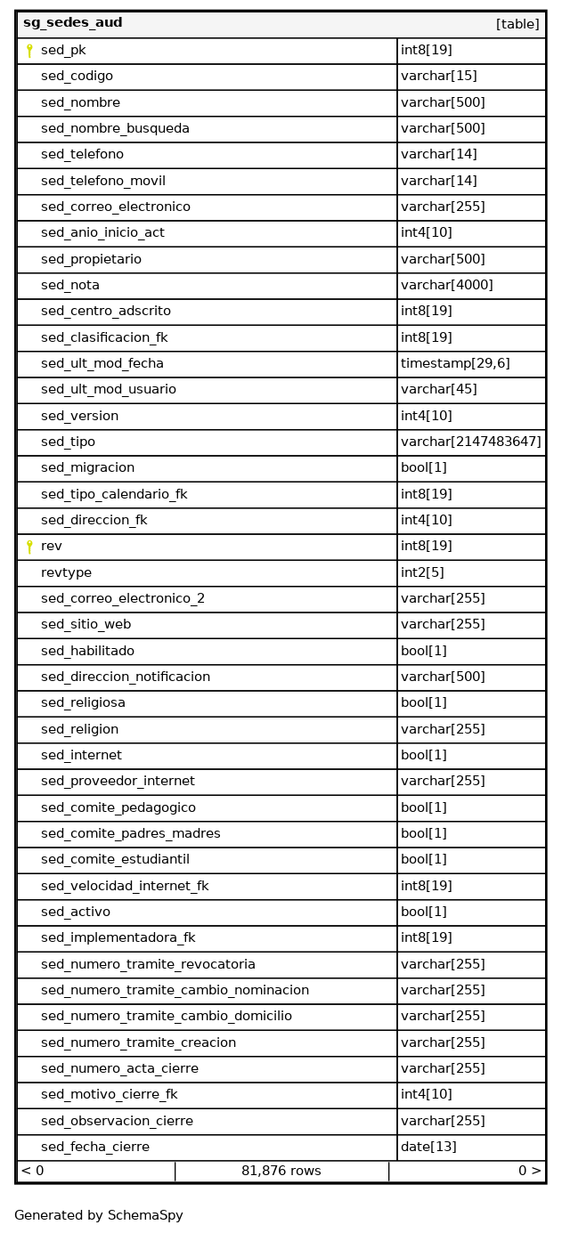 | sg_sedes_aud_pkey | Primary key | Asc/Asc | sed_pk + rev |