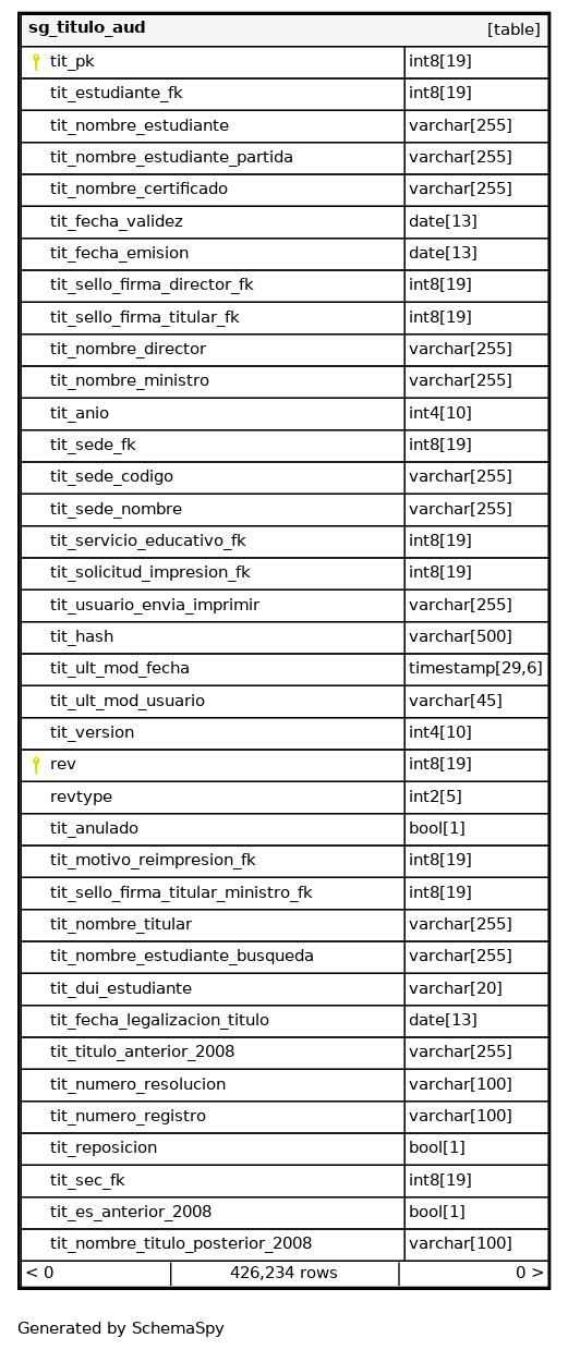 | sg_titulo_aud_pkey | Primary key | Asc/Asc | tit_pk + rev |