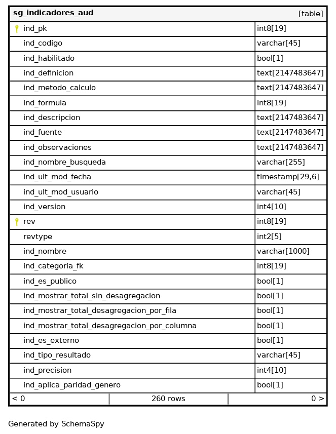 | sg_indicadores_aud_pkey | Primary key | Asc/Asc | ind_pk + rev |